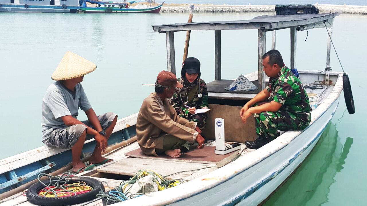 TNI tidak hanya meminta warga datang ke lokasi bakti sosial kesehatan, tapi juga mendatangi langsung warga yang membutuhkan pemeriksaan kesehatan. Itulah gambaran ketika TNI menggelar bakti sosial kesehatan di Taman Wisata Pulau Tunda, Desa Wargasara Kecamatan Tirtayasa Kabupaten Serang, Banten, Sabtu (23/9/2017).