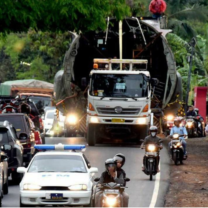 Beginilah suasana di jalan raya ketika badan Hercules diangkut truk trailer. Foto: @militer.udara