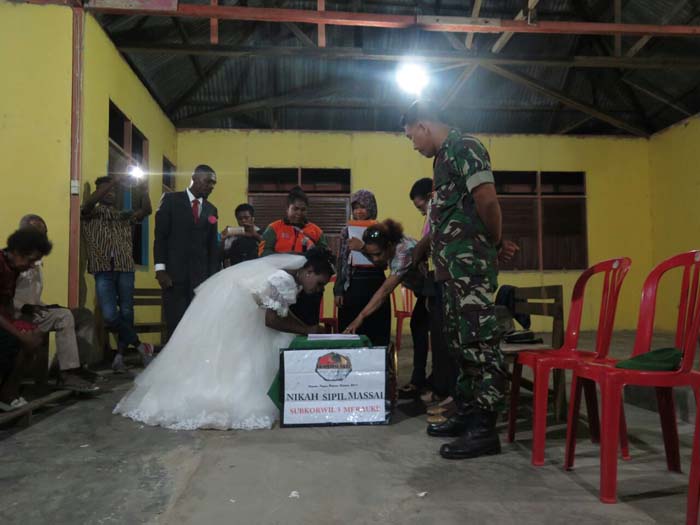 “Tujuan dilaksanakan kegiatan Nikah Massal ini  untuk memenuhi persyaratan administrasi pembuatan surat akta lahir anak, sehingga anak-anak tidak kesulitan untuk mendaftar sekolah, bekerja dan keperluan administrasi lainnya,” ujar Letda Inf Alion Ria, Komandan Tim Pengabdian Masyarakat Subkorwil-3/ Merauke.