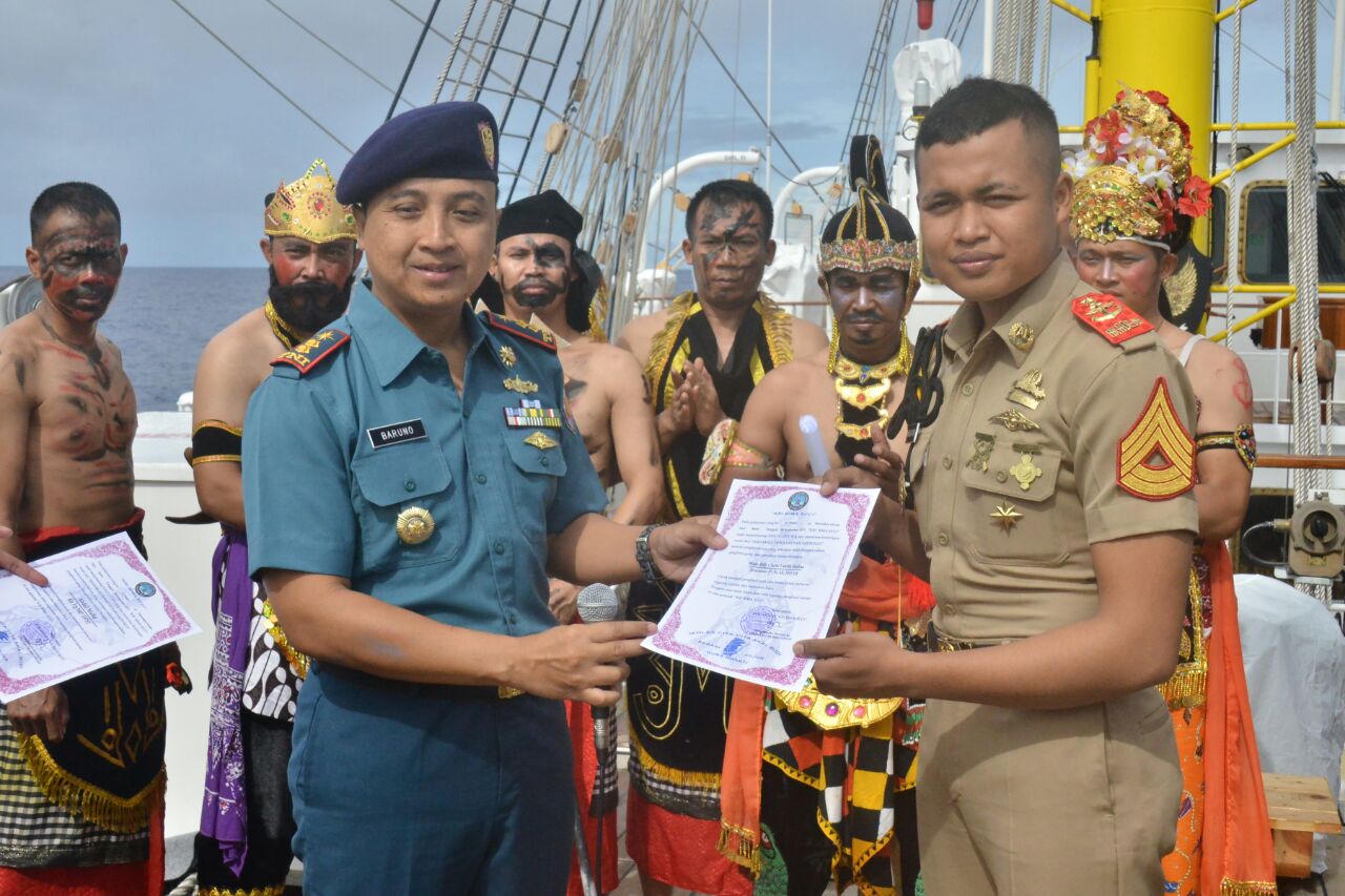 Diakhir kegiatan, Komandan KRI Bima Suci dan Komandan Satgas KJK 2017 memberikan sertifikat dan foto bersama sebagai tanda berakhir kegiatan tradisi mandi Khatulistiwa.