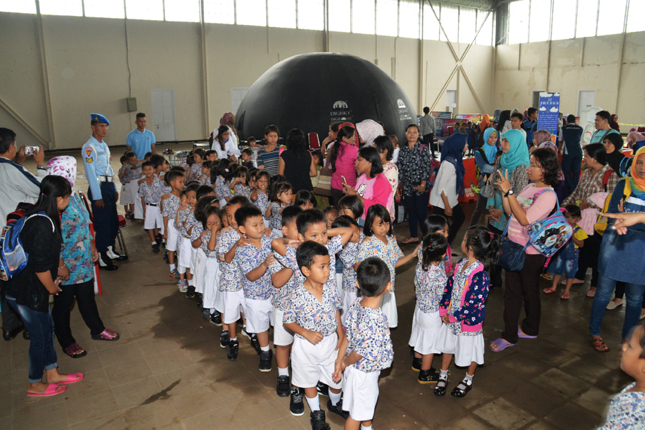 Hari pertama pertunjukan teater Planetarium di hanggar Pusat Pendidikan Terbang Layang (Pusdik Terla) Lanud Suryadarma, Kalijati, Jawa Barat, Rabu (15/11/2017), dibanjiri ribuan siswa Taman Kanak-Kanak dan Sekolah Dasar dari Kabupaten Subang.
