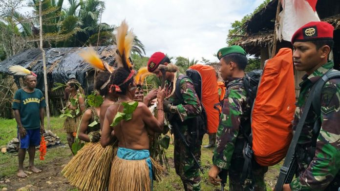 Lettu Inf Andre menerima tanda mata dari kepala suku saat perpisahan. Foto: Via channel-indonesia.com