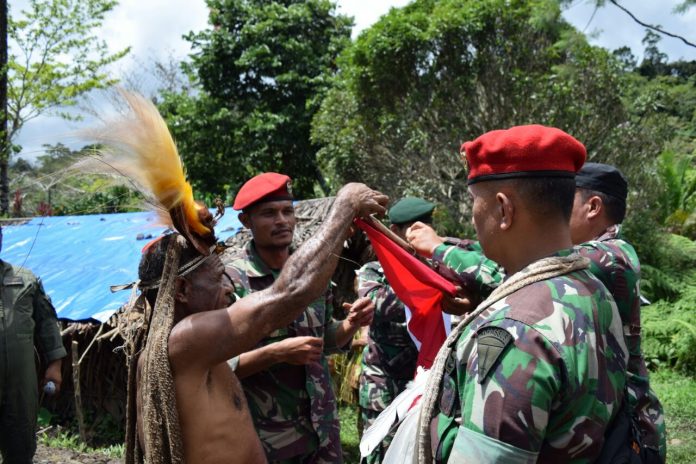 Untuk itu Ade meminta warga mengibarkan Bendera Merah Putih yang diserahkannya kepada kepala suku.