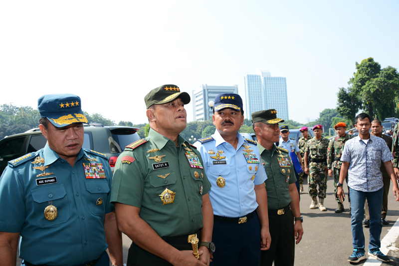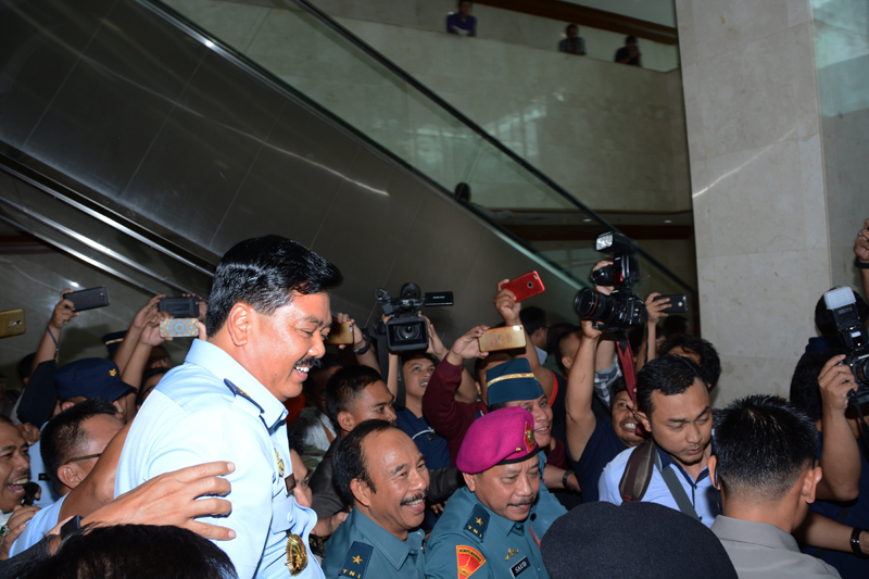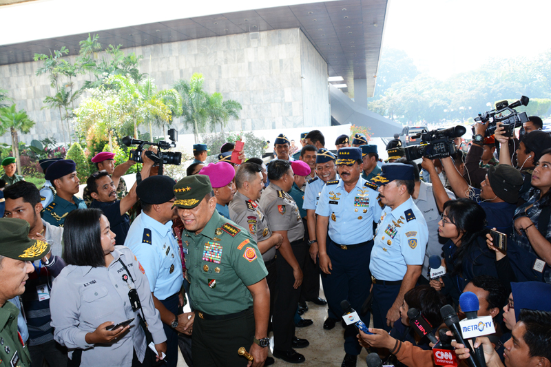- Panglima TNI didamping KSAD dan KSAL, mengantarkan Marsekal Hadi ke DPR RI. Foto: beny adrian