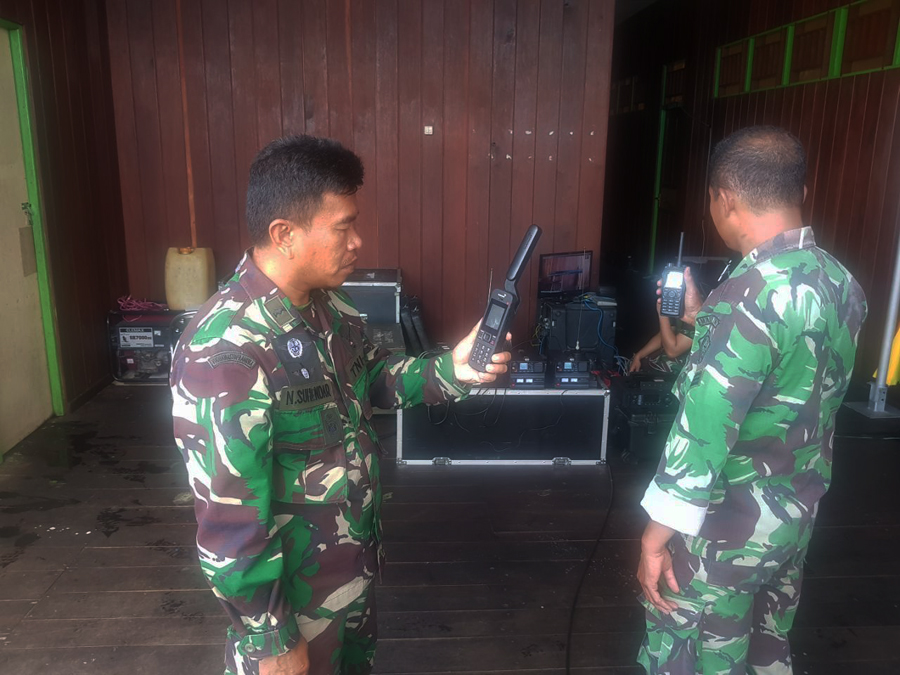 Tim Satkomlek TNI dibawah pimpinan Kapten Chb Edy Sunanto, melakukan pemasangan dan gelar alat komunikasi dari Posko Satgaskes TNI yang terhubung dengan seluruh distrik Kabupaten Asmat, Senin (5/2/2018).
