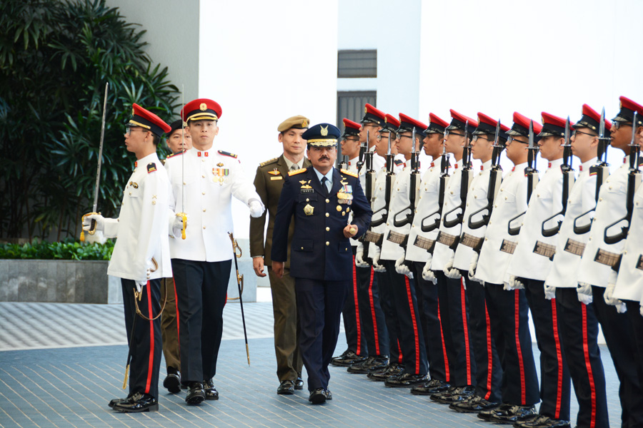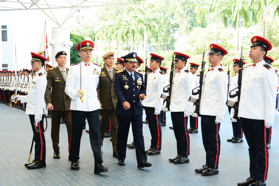 - Panglima TNI Marsekal Hadi Tjahjanto menerima jajar kehormatan di kantor Kementerian Pertahanan Singapura. Foto: beny adrian