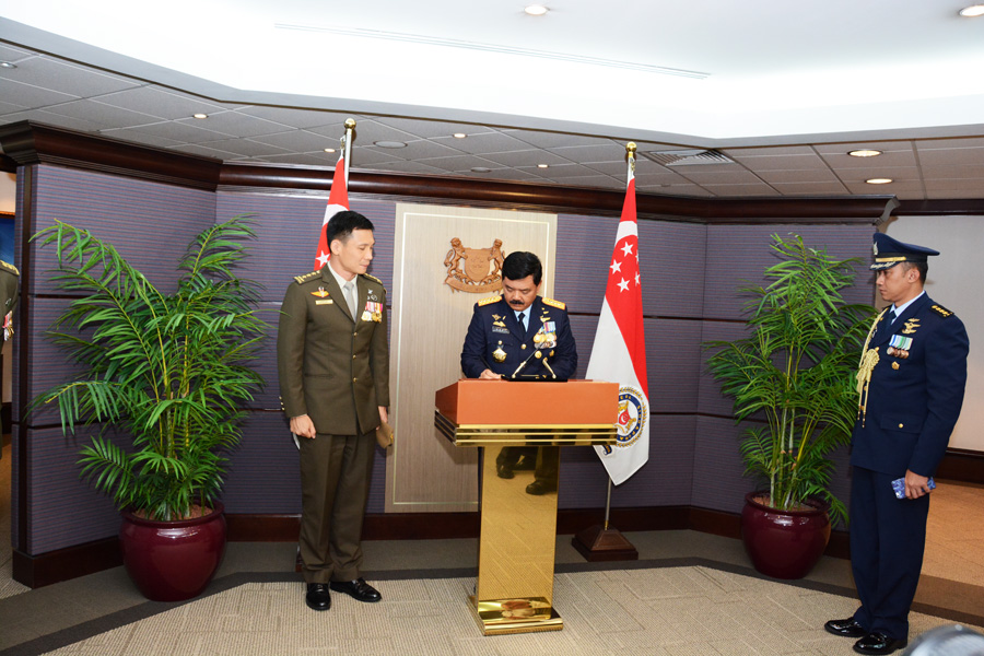 - Panglima TNI Marsekal Hadi Tjahjanto mengisi buku tamu Kemnhan Singapura. Foto: beny adrian