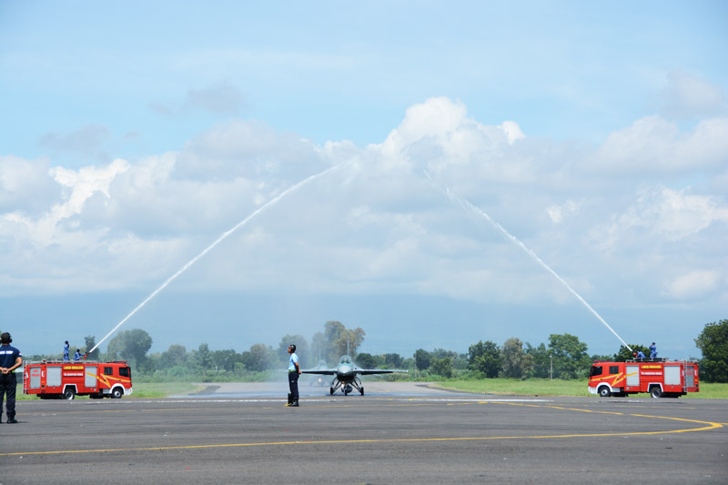 Seremoni penerimaan 24 F-16C/D Block 52ID dilakukan melalui prosesi pelangi (pesawat melewati pancaran air kehormatan). Sebanyak 10 pesawat yang tadi melakukan flypast, mewakili 14 pesawat lainnya untuk mengikuti tradisi penerimaan.
