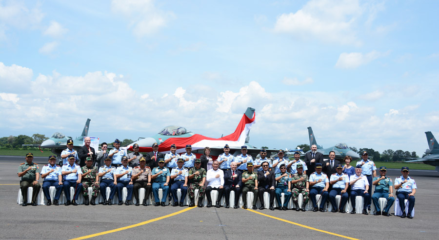 Foto bersama seluruh pendukung program Bima Sena II (berdiri di belakang) bersama Menhan, Panglima TNI, ketiga Kepala Staf Angkatan dan Dubes AS. Foto: beny adrian
