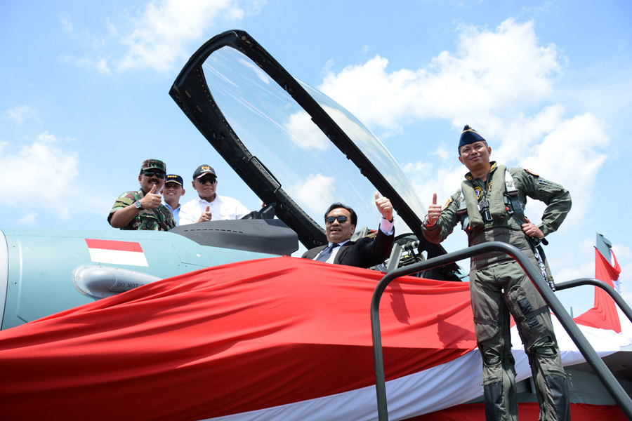 Menhan meninjau F-16C/D didampingi Panglima TNI dan KSAU. Anggota Komisi I Efendi Simbolon duduk di kokpit didampingi Komandan Skadron 3 Letkol Yoga. Foto: beny adrian