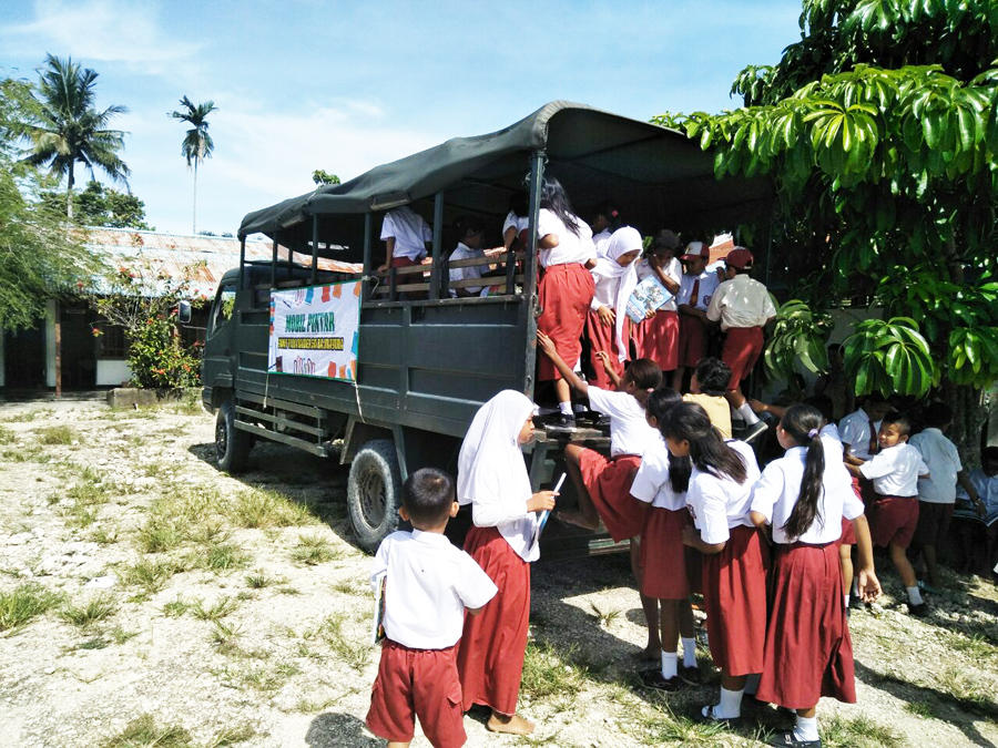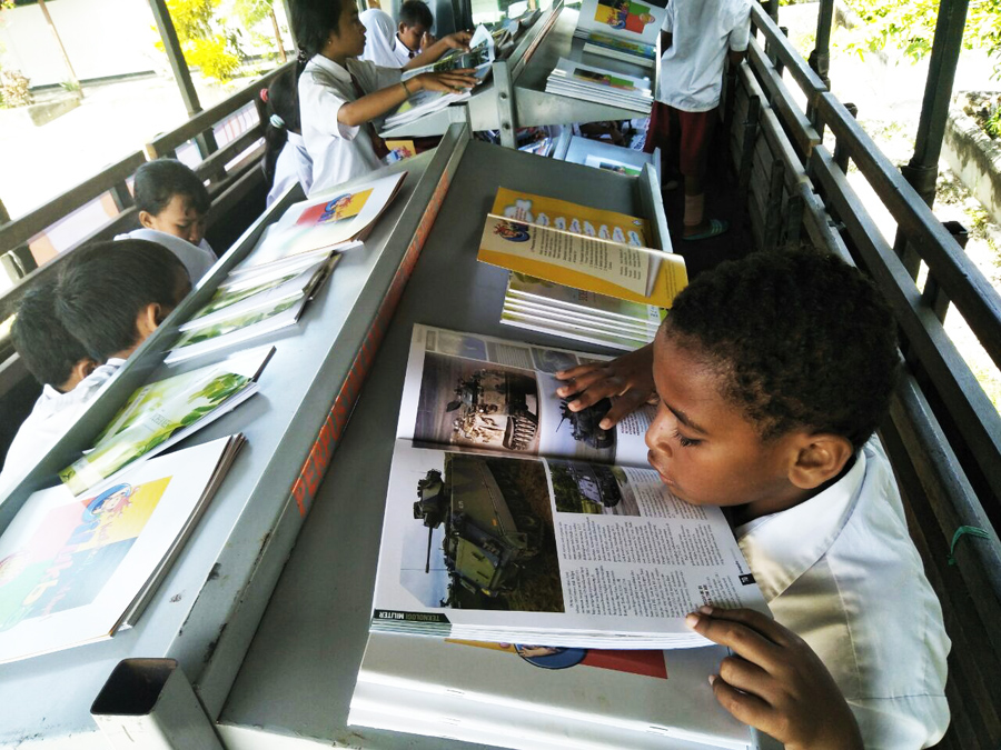 Guna meningkatkan minat membaca bagi anak anak, Satgas Yonif Para Raider 501 Kostrad membuat Perpustakaan Keliling (Mobil Pintar).