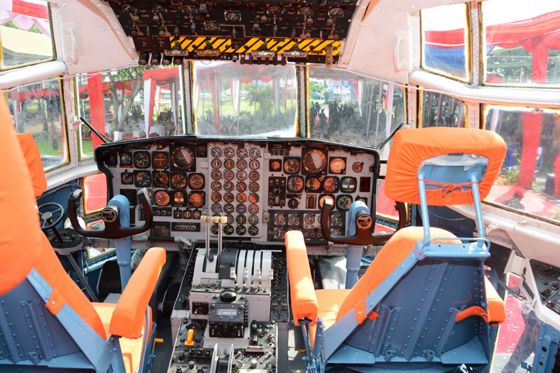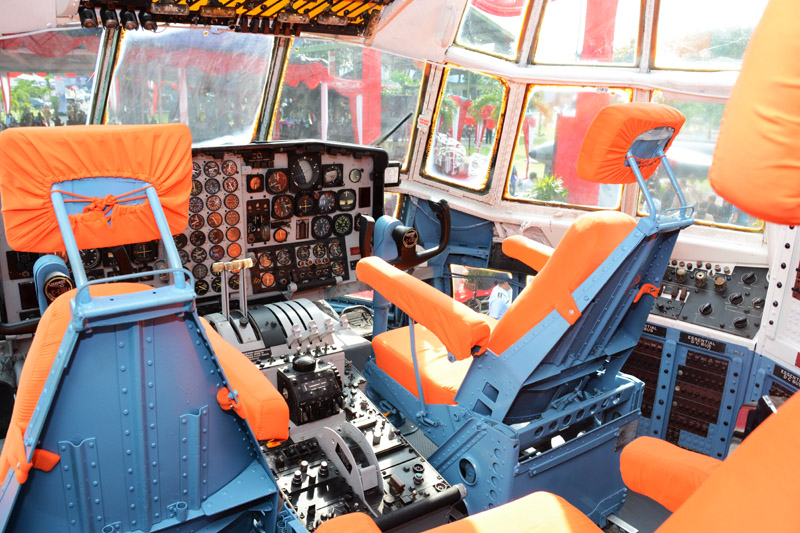 Pengunjung bisa mengetahui, seperti apa sih kondisi di dalam kabin Hercules? Bahkan bisa duduk di kokpit yang didominasi warna oranye itu.