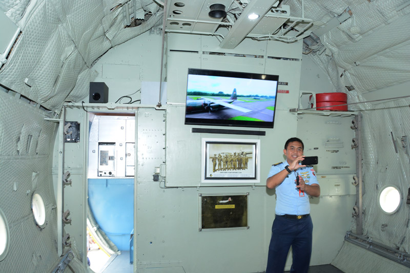 Di dinding kabin juga ditampilkan informasi menyangkut pesawat Hercules ini. Intinya pengunjung dimanjakan untuk menikmati sensasi di dalam kabin Hercules yang dilengkapi pendingin ruangan itu.