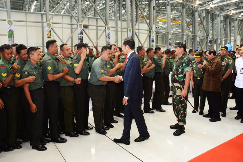 Tiba di hanggar KFX/IFX milik Kementerian Pertahanan di komplek PT Dirgantara Indonesia, Selasa (17/7/2018) pagi, Presiden Joko Widodo disambut 4.500 Bintara Pembina Desa (Babinsa) dari seluruh Indonesia.