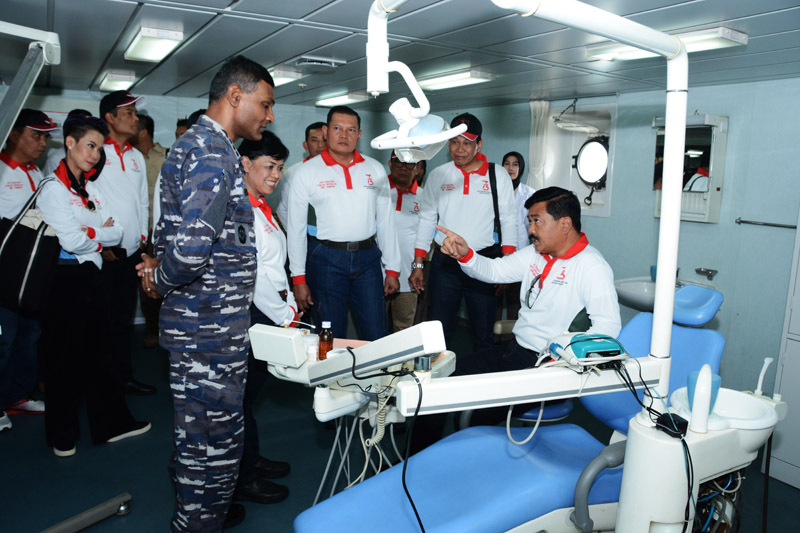 Didampingi Kepala Dinas Kesehatan TNI AL Laksma TNI drg. R.A. Nora Lelyana dan Kepala Rumah Sakit Angkatan Laut dr. Mintohardjo Kolonel Laut (K) dr. Wiweka, Marsekal Hadi dan rombongan diajak berkeliling Dek C yang salah satunya digunakan untuk fasilitas rumah sakit.