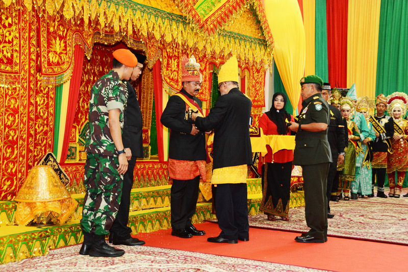 Panglima TNI menerima gelar kehormatan adat Aceh Sri Lilawangsa langsung dari Paduka Yang Mulia Wali Nanggroe Tengku Malik Mahmud Al Haytar.