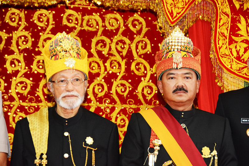 Paduka Yang Mulia Wali Nanggroe Tengku Malik Mahmud Al Haytar memasangkan selempang, pin, dan sebilah rencong untuk Marsekal Hadi. Foto: beny adrian/ mylesat.com