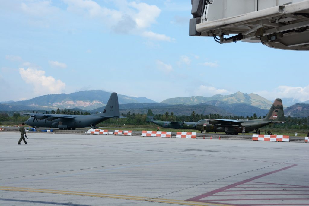 Pesawat C-130 Hercules milik Australia, Singapura, dan Korea Selatan (di landasan) di Palu. Foto: beny adrian/ mylesat.com