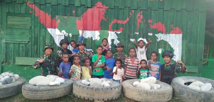 Letda Inf Permadi Permana menyampaikan bahwa sengaja mengajak anak-anak di sekitar pos untuk datang ke pos menggambar dan mewarnai Peta Indonesia dengan maksud menumbuhkan rasa cinta kepada tanah air sejak dini kepada mereka.