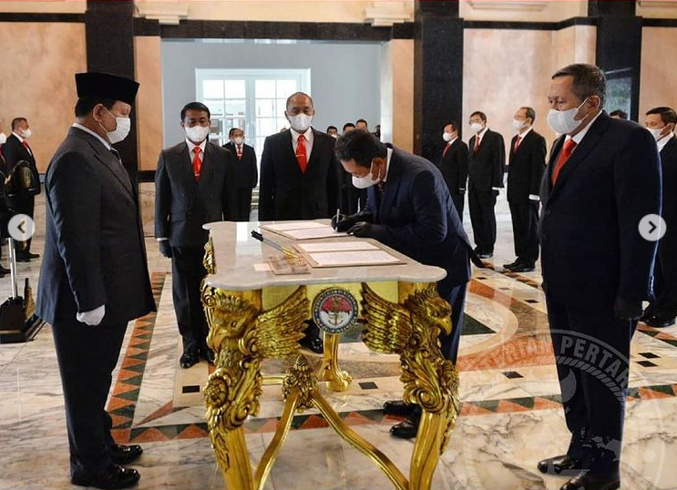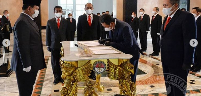 MYLESAT.COM – Menteri Pertahanan Prabowo Subianto selaku Ketua Harian Komite Kebijakan Industri Pertahanan (KKIP), memimpin Upacara Pengambilan Sumpah dan Pelantikan Pejabat Tim Pelaksana dan Tim Ahli KKIP. Upacara dilaksanakan di Ruang Hening Gedung Soedirman Kementerian Pertahanan, Jakarta, Senin (14/12).