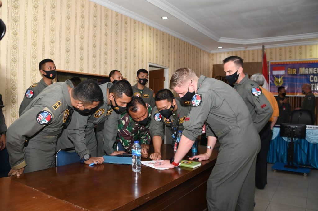 Penebrang TNI AU dan USAF melaksanakan diskusi singkat usai mengikuti briefing Cope West 2021 pagi ini. Foto: beny adrian/ mylesat.com