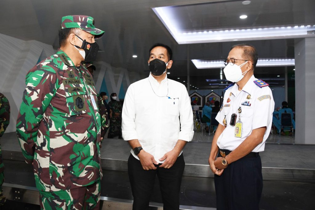 KSAU Marsekal Fadjar Prasetyo berdialog dengan Dirut AP II Muhammad Awaluddin, dan Kepala Pusat Penelitian dan Pengembangan Perhubungan Udara Mohamad Alwi saat meninjau serbuan vaksin Covid-19 di Bandara Halim Perdanakusuma. Foto: beny adrian/ mylesat.com