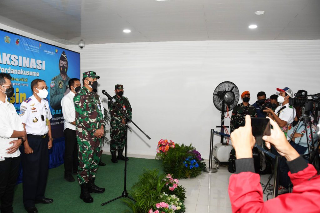 KSAU Marsekal Fadjar Prasetyo memberikan penjelasan kepada awak media yang meliput serbuan vaksin Covid-19 di Bandara Halim Perdanakusuma. Foto: beny adrian/mylesat.com