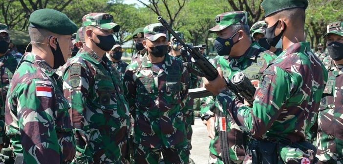 MYLESAT.COM – Kasum TNI Letjen TNI Eko Margiyono, memeriksa kesiapan operasi (Riksiapops) Satgas Pamtas Penyangga (Mobile) RI-PNG Yonif Para Raider 431 Kostrad. Pemeriksaan berlangsung di lapangan Okatangibilang Mabrigif Para Raider 3 Kostrad, Kariango, Tanralili, Maros, Sulawesi Selatan, Rabu (28/7/2021).