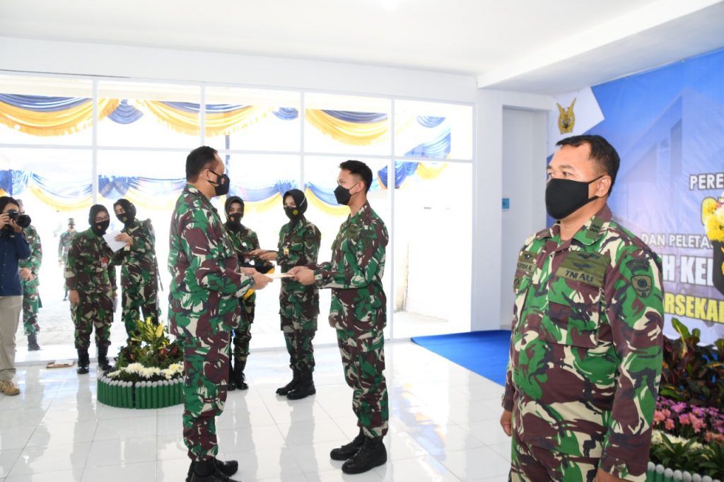 KSAU Marsekal TNI Fadjar Prasetyo menyerahkan secara simbolis rumah non dinas kepada Letda Pnb Dwikie dan Peltu Satria N. Foto: beny adrian/ mylesat.com