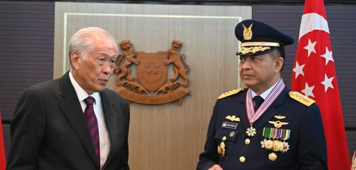 Menhan Dr Ng Eng Hen memberikan ucapan selamat kepada KSAU Marsekal Fadjar Prasetyo usai menerima Meritorious Service Medal (Military). Foto: beny adrian/ mylesat.com