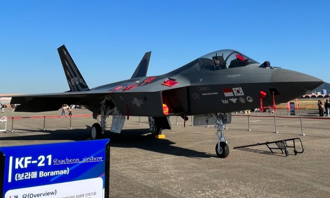Jet tempur terbaru KF-21 Boramae dipamerkan di sebuah pangkalan udara di Sacheon, Provinsi Gyeongsang Selatan, Kamis, saat berlangsungnya pameran kedirgantaraan selama empat empat hari (20-23 Oktober 2022).