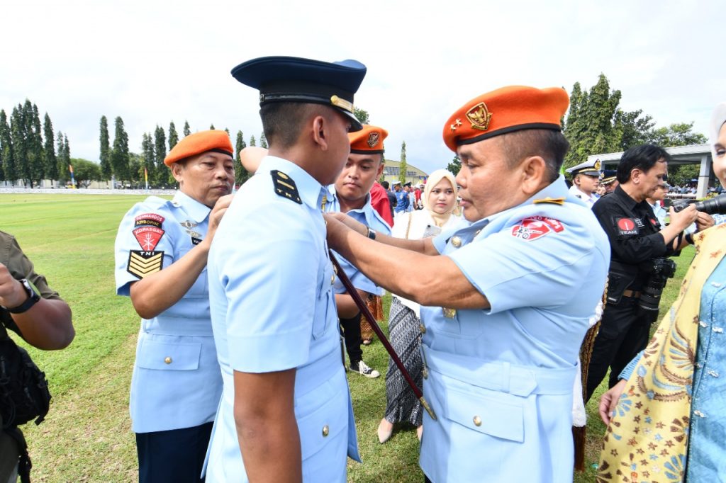 Komandan Kopasgat Marsda TNI Taspin Hasan, menyematkan wing penerbang kepada Letda Pnb Ilhampatah yang merupakan putra anggota Kopasgat Serma Nurul Patah. Foto: beny adrian/ mylesat.com