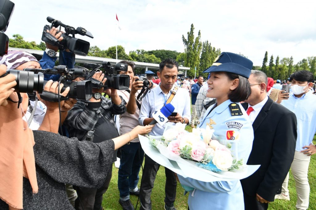 Usai disematkan wing penerbang oleh kedua orang tuanya, terlihat Veronika dikerubuti wartawan yang meliput upacara Wingday Sekbang TNI AU ini.