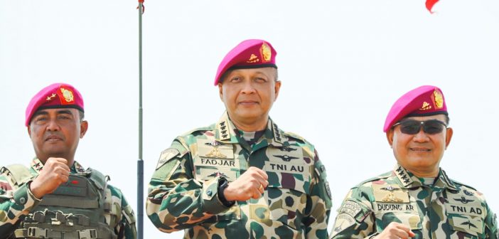 KSAU Marsekal TNI Fadjar Prasetyo mengikuti skenario perebutan sasaran dalam prosesi pembaretan warga kehormatan Korps Marinir TNI AL. Foto: Dispenau