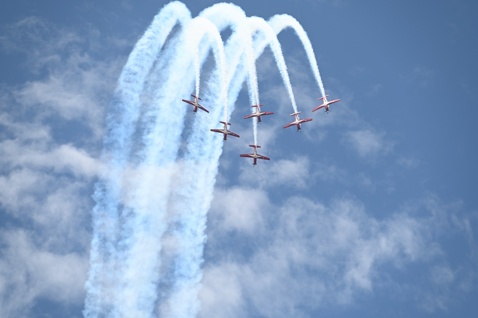 Benar saja, kali ini giliran sepasang Hornet lainnya melesat kencang dari arah depan dan berpencar di depan hadirin sambil melepaskan chaff-flare. Diikuti empat pesawat Hawk 100/200 yang membuat manver bomb burst.