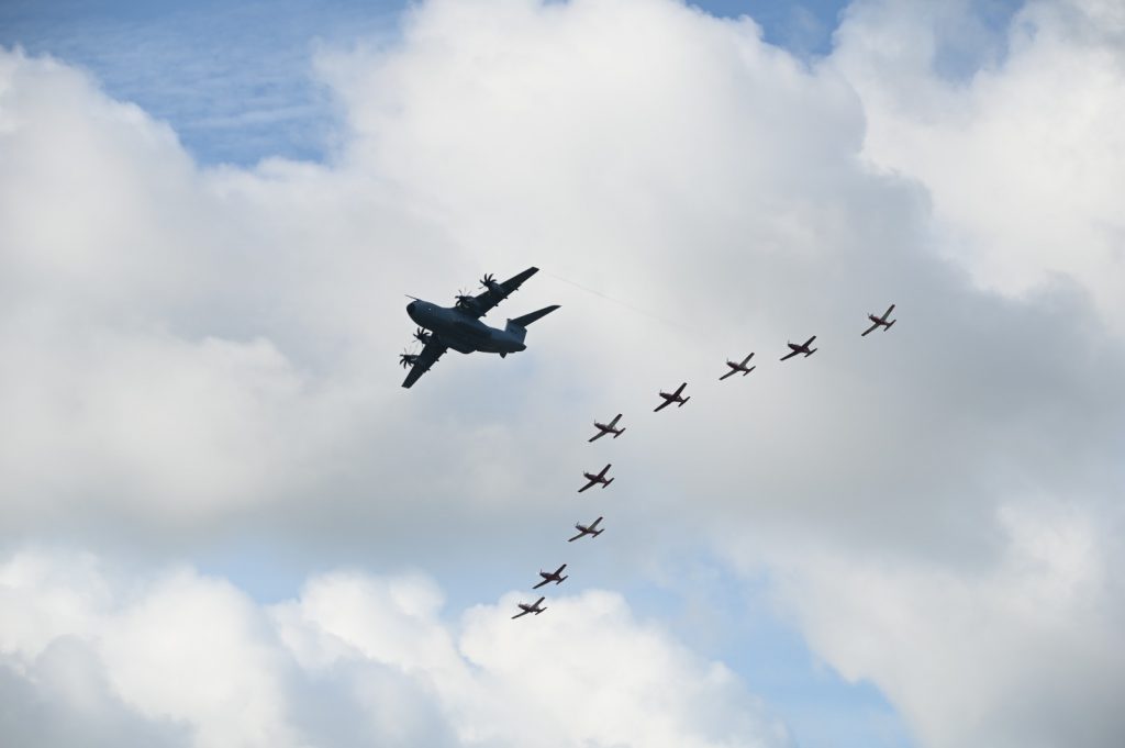 Lagi-lagi dari arah depan, dari kejauhan terlihat titik besar yang rupanya pesawat angkut A-400M Atlas diikuti oleh sembilan pesawat latih Pilatus PC-7 Mk II.