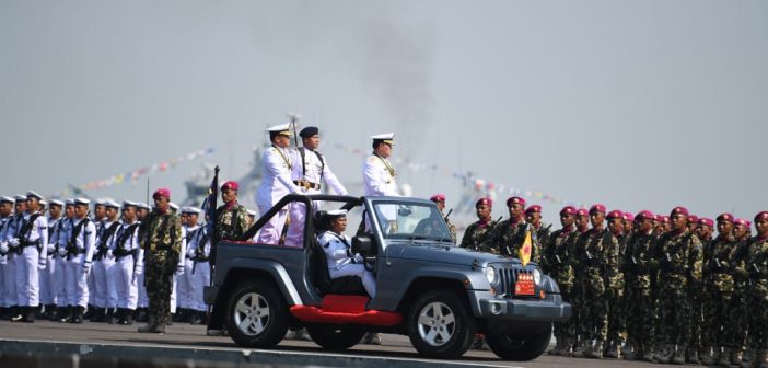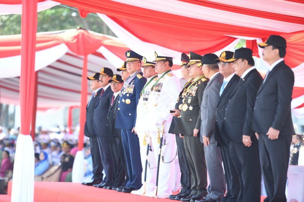 Panglima TNI Laksamana TNI Yudo Margono didampingi Kapolri dan ketiga Kepala Staf serta para mantan KSAL, menyaksikan defile pasukan peserta upacara HUT TNI AL ke-78. Foto: beny adrian/ mylesat.com