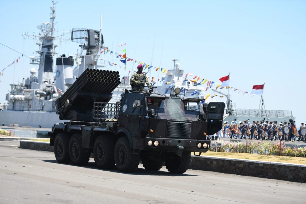 Sistem peluncur roket RM-70 MLRS Korps Marinir melintas saat defile pasukan. Foto: beny adrian/ mylesat.com