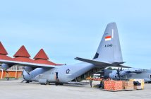 Prajurit Yonko 468 Sarotama mengamankan pesawat C-130J Super Hercules TNI AU yang membawa rombongan KSAU di Wamena. Foto: beny adrian/ mylesat.com